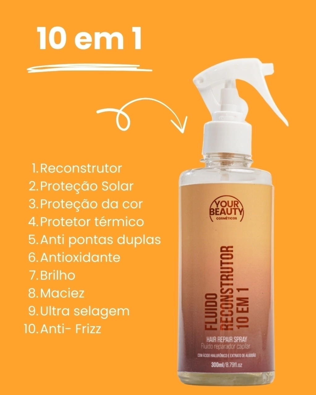 Nosso Fluido Finalizador Reconstrutor 10 em 1 é um tratamento multifuncional que protege, reconstrói e realça a beleza natural dos cabelos desde a primeira aplicação.